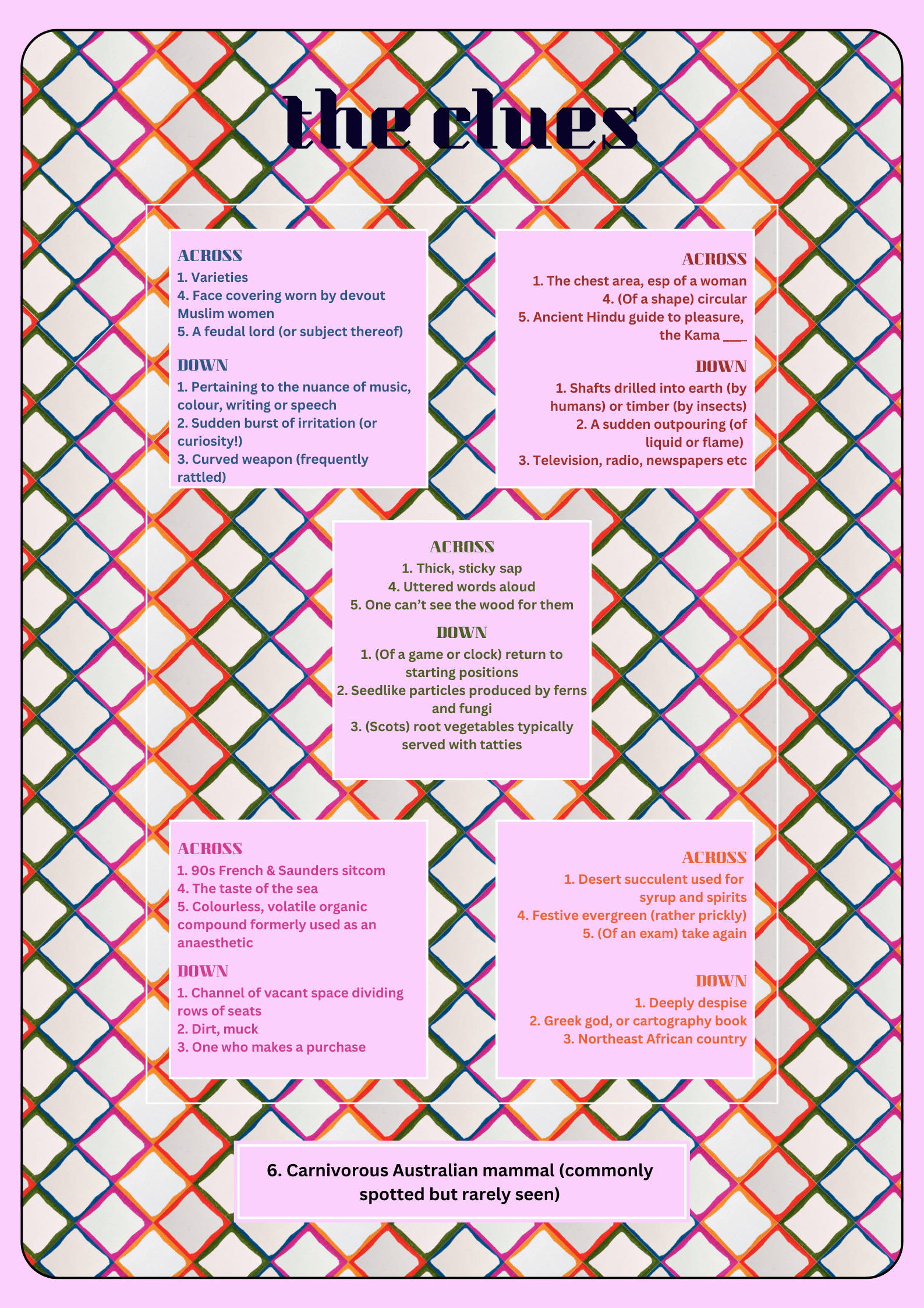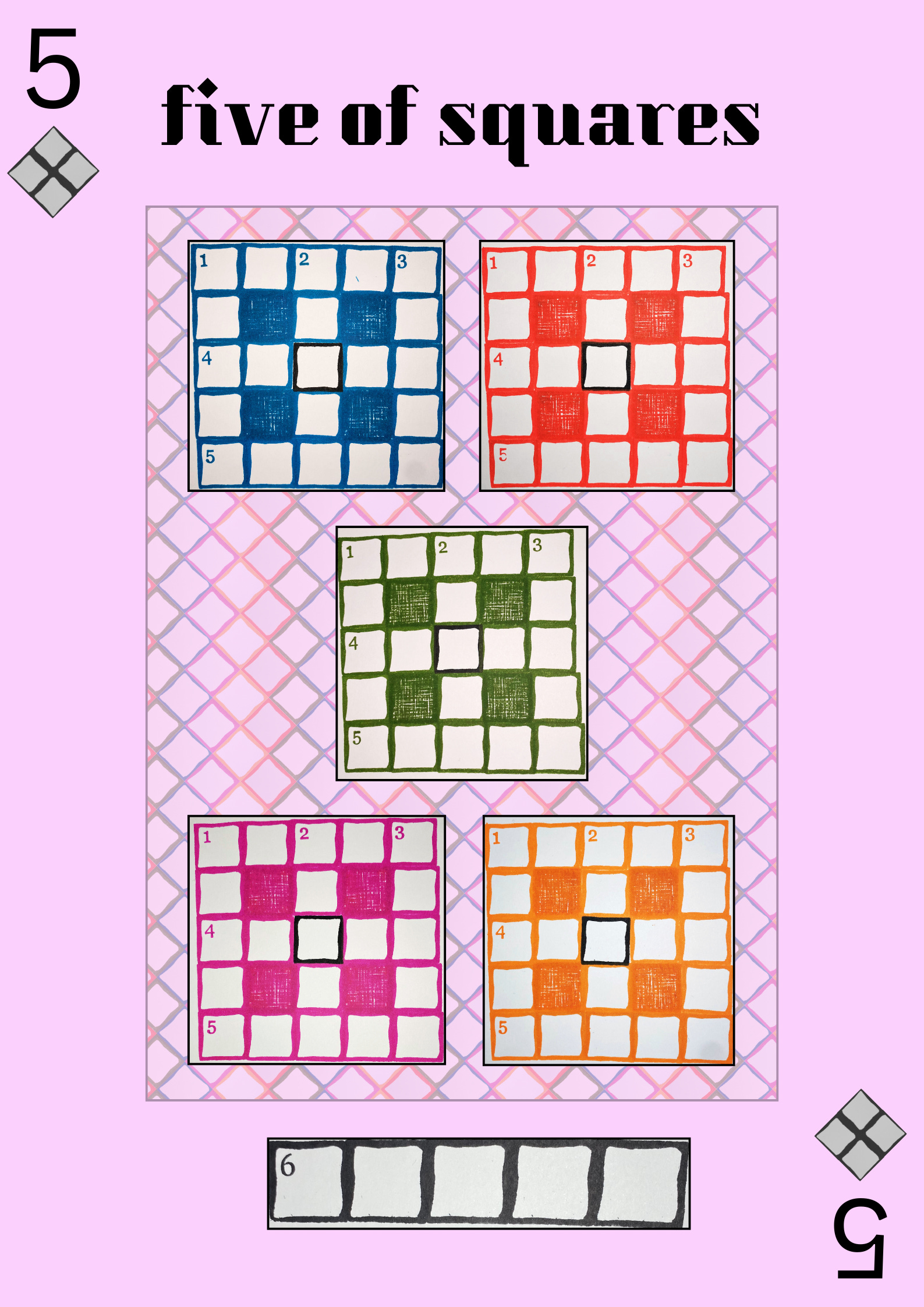 I shall leave you with a puzzle! This one’s called Five of Squares, and it’s a love letter both to five-letter words (…Wordle, anyone?) and playing card design. Hopefully it’s fairly self-explanatory: the middle letter (highlighted in black) from each of the 5x5 grids (read L-R, top-bottom) forms the answer to bonus clue 6 (or should that be 25…) Answers next week, as usual.